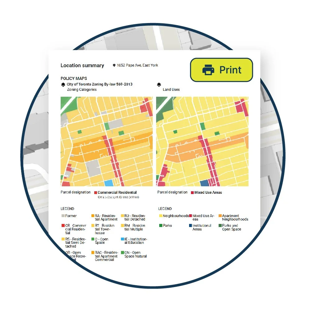 In under a minute, you can access ALL planning and policy data relevant to a specific address. Our reports provide parcel designation, statistics, existing building height, public assets, and more, along with direct links to the relevant policy documentation. This saves you the time of digging through city websites and lengthy PDF’s, summarizing what is applicable to your site and supports you in understanding what you can build.